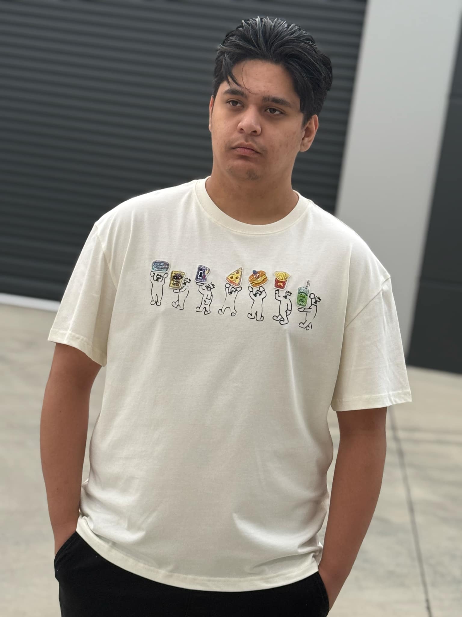 The "Munchies" Tee brings together all your favorites—chips, soda, pizza, fries, and more—on a lineup of quirky little snack buddies. Printed/ embroidered on a cotton, it's the perfect mix of fun, laid-back, and effortlessly cool.